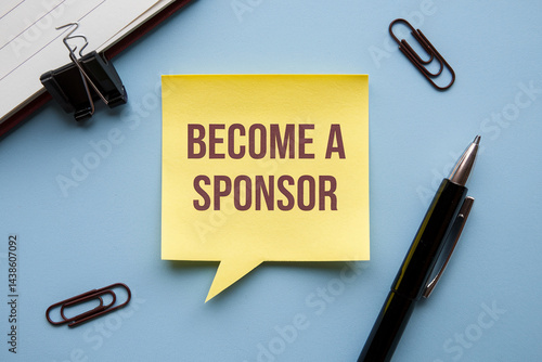 Yellow sticky note with "Become a Sponsor" text, speech bubble shape, on blue background, with pen and paper clips nearby, showcasing sponsorship opportunities