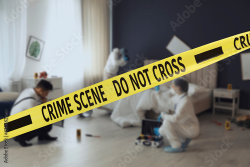 Yellow tape blocking way to crime scene. Investigator and criminologist working in room