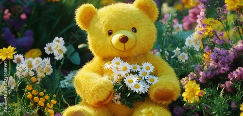 Yellow teddy bear holding a bouquet of daisies in a vibrant spring garden