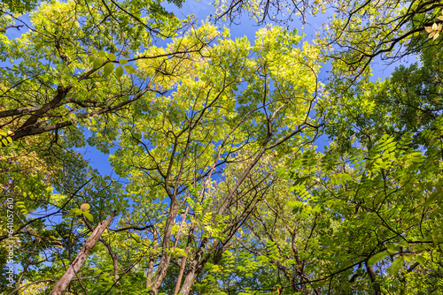 yellow treetops in autumn forest illuminated by sun during bright sunny day.