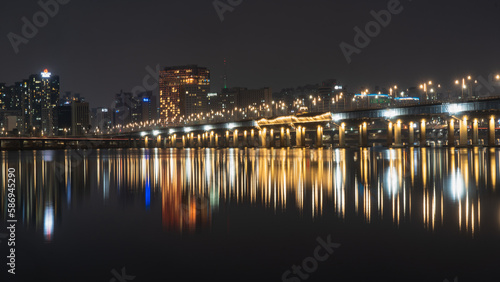 Yeouido hangang riverside park and beautiful nightscape near Mapo bridge during winter night at Yeongdeungpo , Seoul South Korea : 5 February 2023