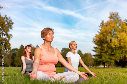 Yoga in the park, senior woman doing exercises with group of mixed age people
