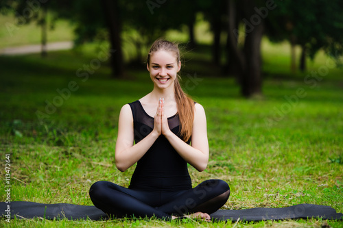 Yoga outdoors in warm autumn sunny park. Woman sits in lotus position zen gesturing. Concept of healthy lifestyle and relaxation