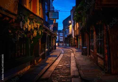 York city's historic alley at sunrise, featuring well-preserved landmark architecture and medieval timber-framed buildings, a popular tourist attraction and shopping area in Yorkshire, England.