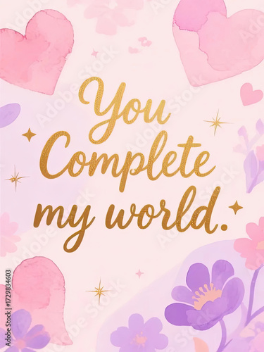 You complete my world gold script on pink floral watercolor background with hearts and stars conveying romantic affectionate sentiment