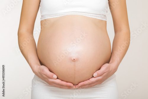 Young adult pregnant woman in white clothes touching big naked belly with hands. Showing shape. Pregnancy concept. Expectation time. Closeup. Isolated on light gray wall background.