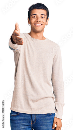 Young african amercian man wearing casual clothes smiling friendly offering handshake as greeting and welcoming. successful business.