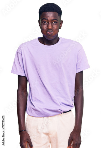 Young african american man wearing casual clothes puffing cheeks with funny face. mouth inflated with air, crazy expression.