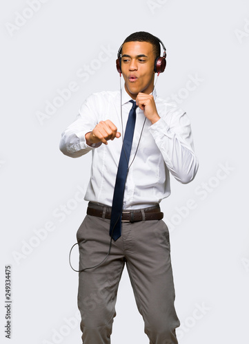 Young afro american businessman listening to music with headphones and dancing on isolated background