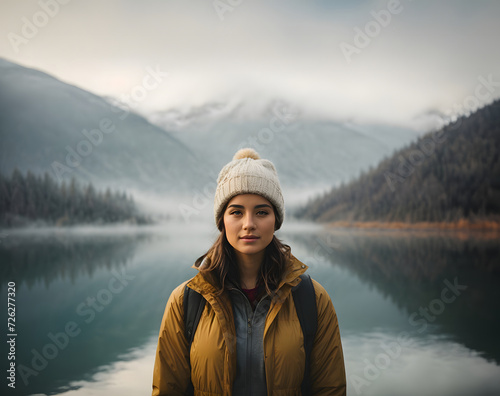 Young and beautiful woman in nature, female hiker at the misty mountain lake in a cold morning