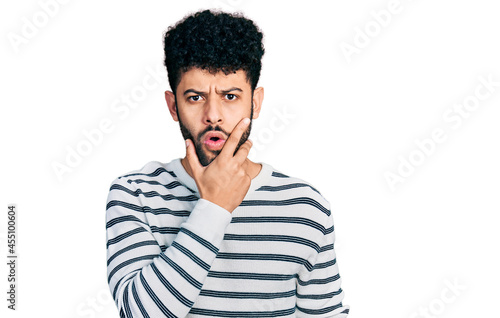 Young arab man with beard wearing casual striped sweater looking fascinated with disbelief, surprise and amazed expression with hands on chin
