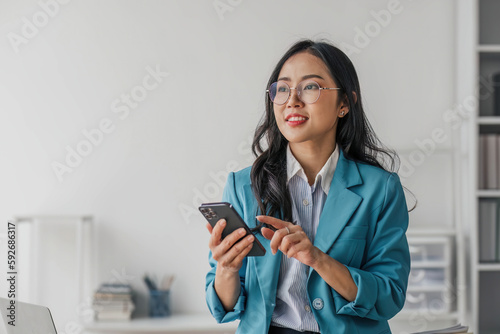 Young asian businesswoman beautiful charming smiling and using the mobile phone in the office.
