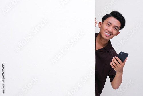 Young Asian man peeking behind a wall holding mobile phone with happy face