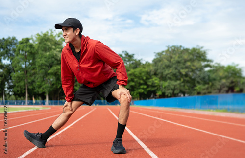 Young asian man wearing sportswear running outdoor. Portraits of Indian man stretching leg before running on the running track at sport stadium. Training athlete work out at outdoor concept.