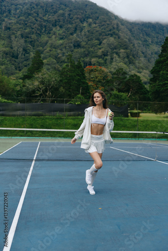 Young athletic woman in sportswear running on a tennis court, showcasing energy and determination in a scenic outdoor setting with lush greenery