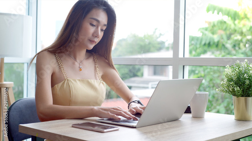 Young beautiful Asian woman enjoying a relaxing moment working and using mobile phone as mobile smart payment to pay for a coffee in the coffeeshop on a bright sunny day
