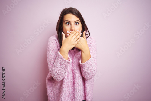 Young beautiful brunette woman wearing a sweater over pink isolated background shocked covering mouth with hands for mistake. Secret concept.