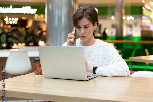 Young beautiful brunette woman wearing white sweatshirt sitting at a shopping center at a table and working at a computer laptop, using mobile phone. Freelance and business concept