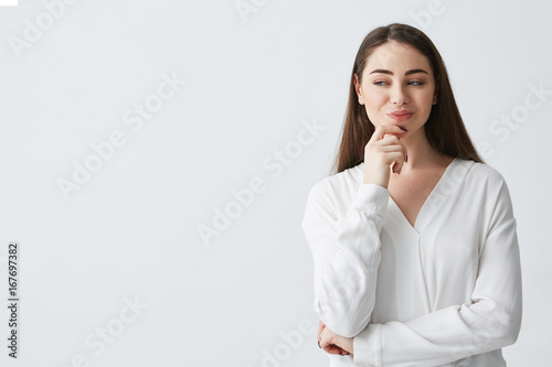 Young beautiful playful businesswoman with cunning tricky glance smiling over white background.