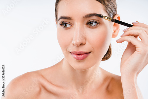 Young beautiful woman applying cosmetic brush on eyebrow, natural makeup on white background