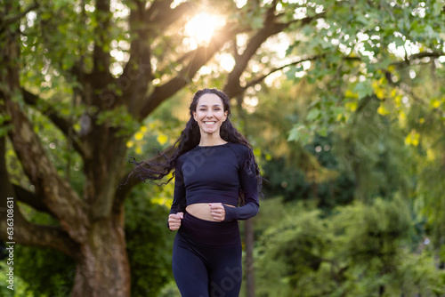 Young beautiful woman running in the park, portrait of a Latin American woman jogging and doing active exercises, sportswoman smiling and looking at the camera among the trees.