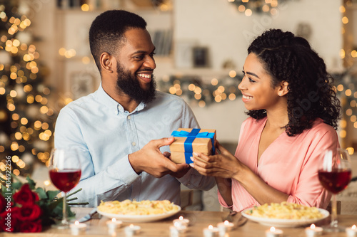 Young black man exchanging gifts with his happy woman