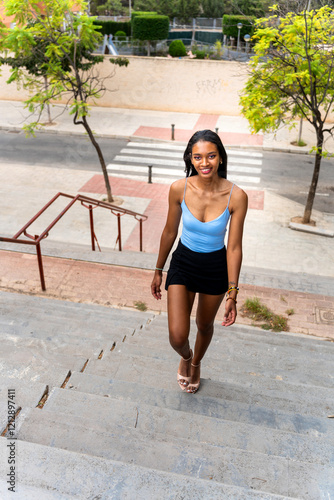 Young black woman walking down stairs in the city