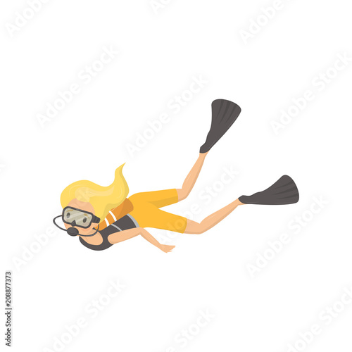 Young blond girl engaged in scuba diving. Cartoon female character in wetsuit, mask and flippers. Flat vector design