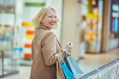 Young blonde woman walking back to camera in shopping center on the background of boutiques. Beauty woman in a denim jacket with shopping bags in shopping mall. Copy space
