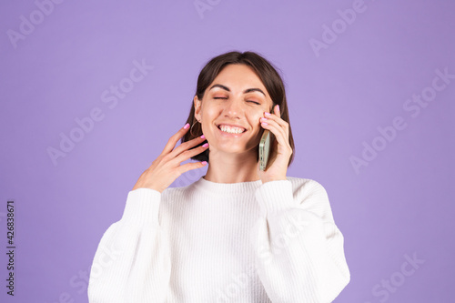 Young brunette in white casual sweater isolated on purple background having conversation with happy mood, talking positive on mobile phone, smiling