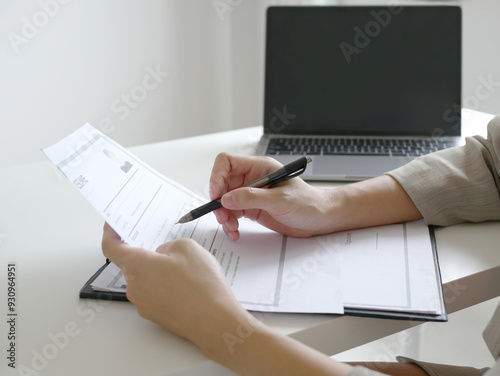 Young businesswoman holds a resume and evaluates it. Views the personal history of job applicants. Recruitment concept