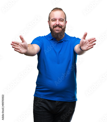 Young caucasian hipster man wearing blue shirt over isolated background looking at the camera smiling with open arms for hug. Cheerful expression embracing happiness.