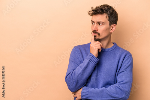 Young caucasian man isolated on beige background looking sideways with doubtful and skeptical expression.