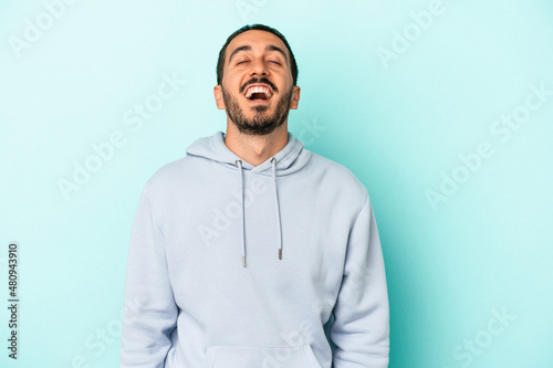 Young caucasian man isolated on blue background relaxed and happy laughing, neck stretched showing teeth.