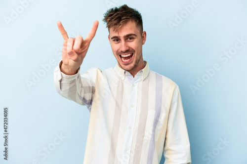 Young caucasian man isolated on blue background showing a horns gesture as a revolution concept.