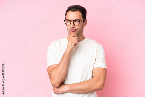 Young caucasian man isolated on pink background having doubts and thinking