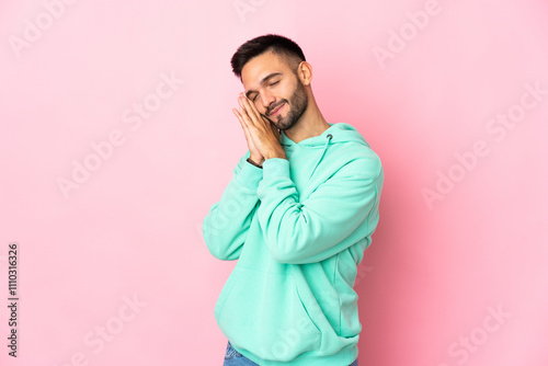Young caucasian man isolated on pink background making sleep gesture in dorable expression