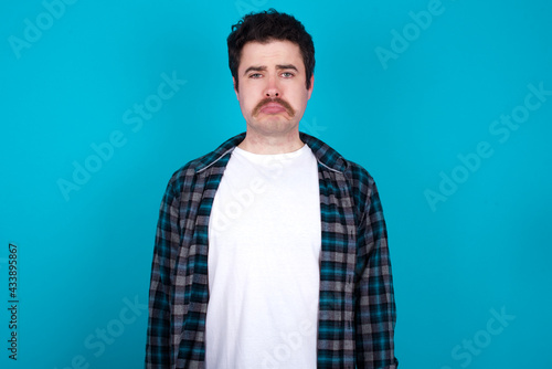 young Caucasian man with moustache wearing plaid shirt against blue wall crying desperate and depressed with tears on his eyes suffering pain and depression. Sad facial expression and emotion concept.