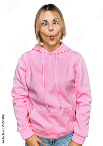Young caucasian woman wearing casual sweatshirt making fish face with lips, crazy and comical gesture. funny expression.