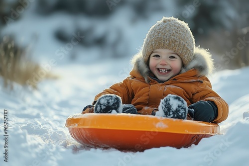 Young child enjoying winter sledding in snowy landscape, winter scene with copy space