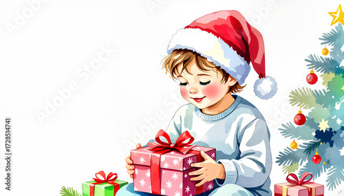 Young child excitedly opening Christmas gift under tree