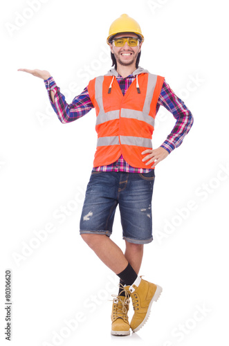 Young construction worker holding isolated on white