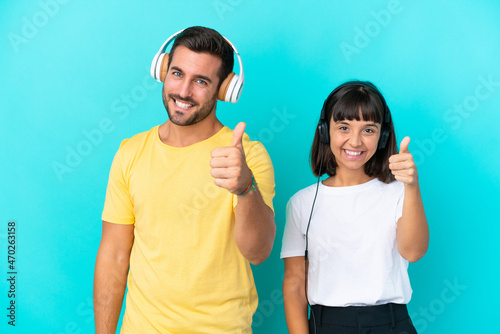Young couple isolated on blue background listening music and with thumb up