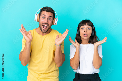 Young couple isolated on blue background surprised and listening music