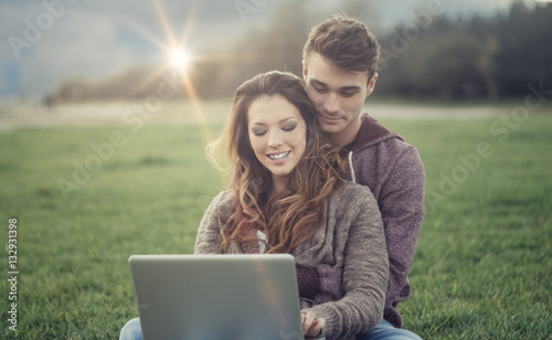 Young couple outdoors using a laptop