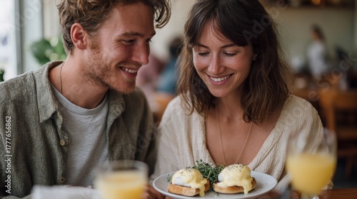 Young couple sitting at a table in a restaurant, enjoying a meal together.