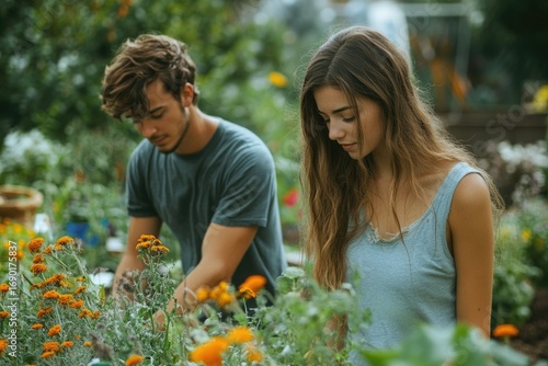 Young couple tending a garden together, showcasing peaceful coexistence and shared passion for nature.