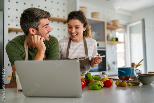 Young couple using laptop computer to take part in online culinary workshop, cooking together