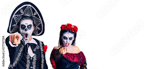Young couple wearing mexican day of the dead costume over background pointing displeased and frustrated to the camera, angry and furious with you