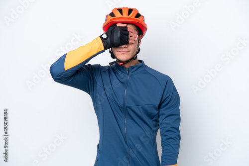Young cyclist caucasian man isolated on white background covering eyes by hands. Do not want to see something